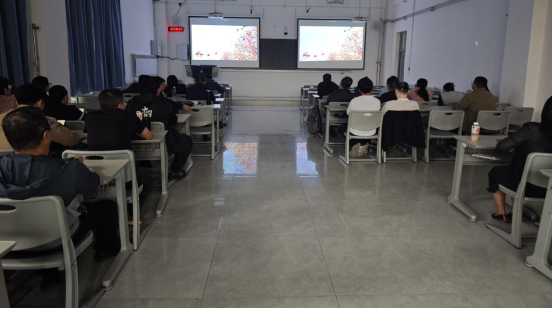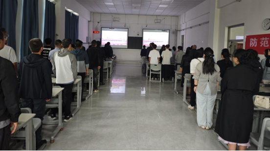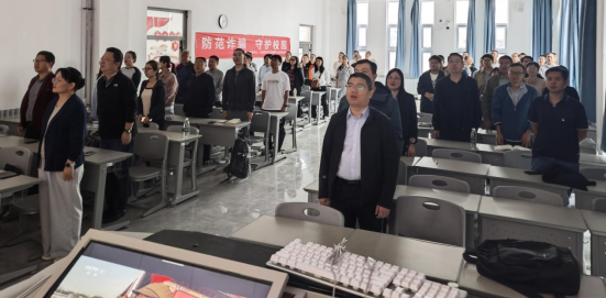 当画面中传来庄严的《义勇军进行曲》,五星红旗冉冉升起时,学院全体领导与教职工自发地全体肃立,神情庄重,目光紧随屏幕上的国旗,齐声高唱国歌。“起来!不愿做奴隶的人们!……”激昂熟悉的旋律在A401会议室回荡,歌声嘹亮,情感真挚。这一自发举动,展现了老师们深厚的家国情怀和崇高的民族自豪感,用最直接的方式表达了他们对祖国的无限热爱与忠诚。